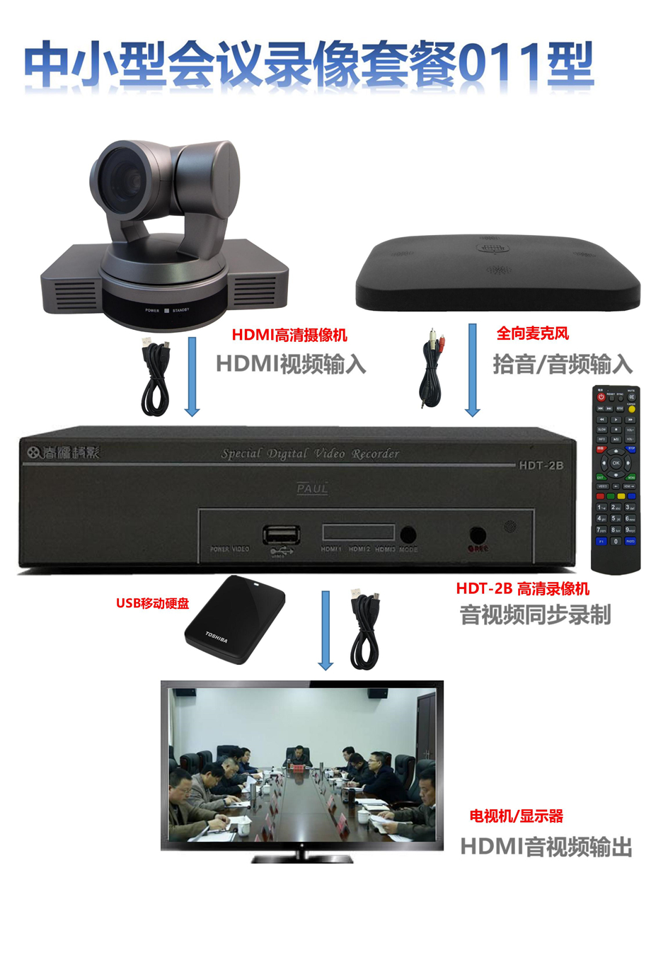 中小型会议,是指会议室面积20-50平米,参会人数在10-50人规模的会议。会议室布局包括了圆桌式、长桌式、教室式等式样。对这种规模的会议录像,有多种设备套餐,根据单位具体需要灵活选择,CYHL-011套餐,是比较经济实惠,操作简便的套餐,具体需要的设备如下: