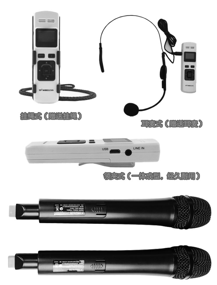 配送有轻便头戴式耳麦、领口夹发送器。支持5G信号,发送距离远,音质好,无噪音。发送器上具有激光教鞭功能,使用更加方便。充电一次可使用8小时以上。