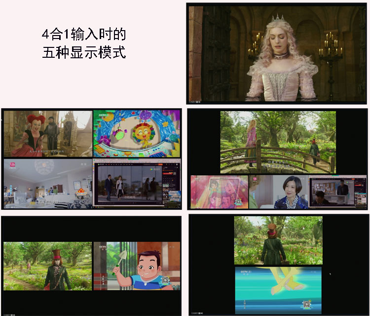 (1)、单窗口显示;(2)、4窗口正方显示;(3)、上1大下3小窗口显示;(4)、左右2窗口显示;(5)、上下2窗口显示;