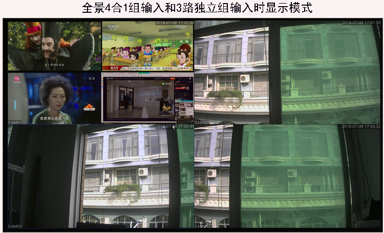 全景高清录播机的四合一全景输入和三个独立的输入接口这两组输入模式,可以同时输入,也可任选输入,用本机接电视机播放时,可以实时直播显示出7个窗口画面。可以一键放大四合一全景窗口,也可一键放大3路独立中的一个窗口。音频选择,可以一键开启四合一输出的音频,也可一键开启3路独立录像的任意一个窗口的音频。