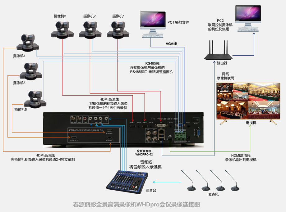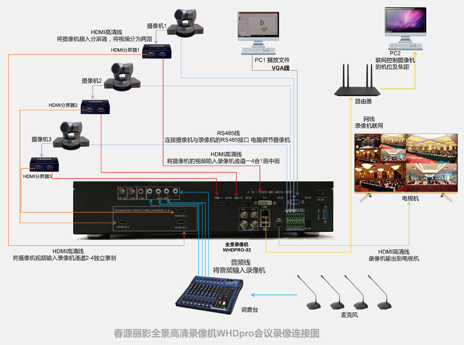有些重要的会议录像,不仅需要将多个摄像头合并录制为一个独立的音视频文件,也需要将其中的几个摄像头再录制为各自单独的音视频文件时,WHDpro-02录播机就可以大显身手了。只需在摄像机的输出接口接入一个HDMI一分二的分屏器,就可以将一个摄像头分别输入给第一通道的四合一全景通道和第二、或者第三、或者第四通道输入接口,就能实现了。该机可以实现将三路高清摄像机分别接入3个分屏器实现这一功能!