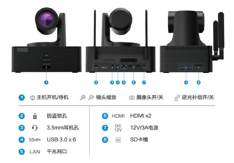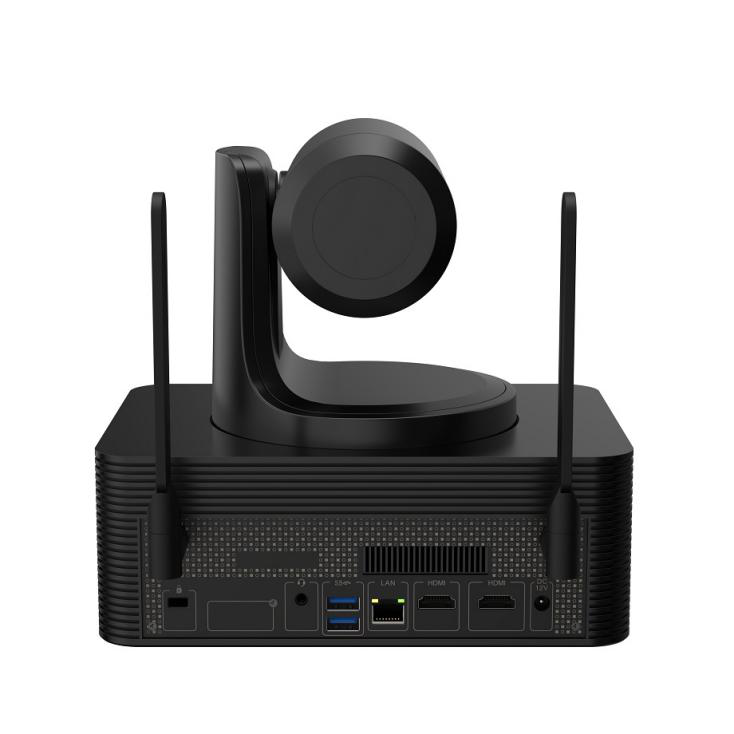 一体式视频会议主机,采用Intel新一代四核心处理器,集成1080p高清云台摄像头(配图)。内置 82.5 度低畸变广角镜头,5 倍光学变焦(可选 12 倍光学变焦)+2 倍电子变焦。缩放自如,所见更多。支持 3D 降噪、背光补偿、自动对焦、抗闪烁、宽动态等功能,画质出众,自适应调节清晰度。具有双 HDMI 输出接口,支持会议视频、共享文档分屏显示 ( 配图 )。标配千兆网口和 5G WiFi 功能,确保通讯质量稳定性。会议主机搭载全向麦克风具AEC( 回声消除 )、ANS( 噪声抑制 )、AGC( 自动增益 )、CNI( 舒适噪声插入 ) 功能,确保通讯音质清晰稳定。