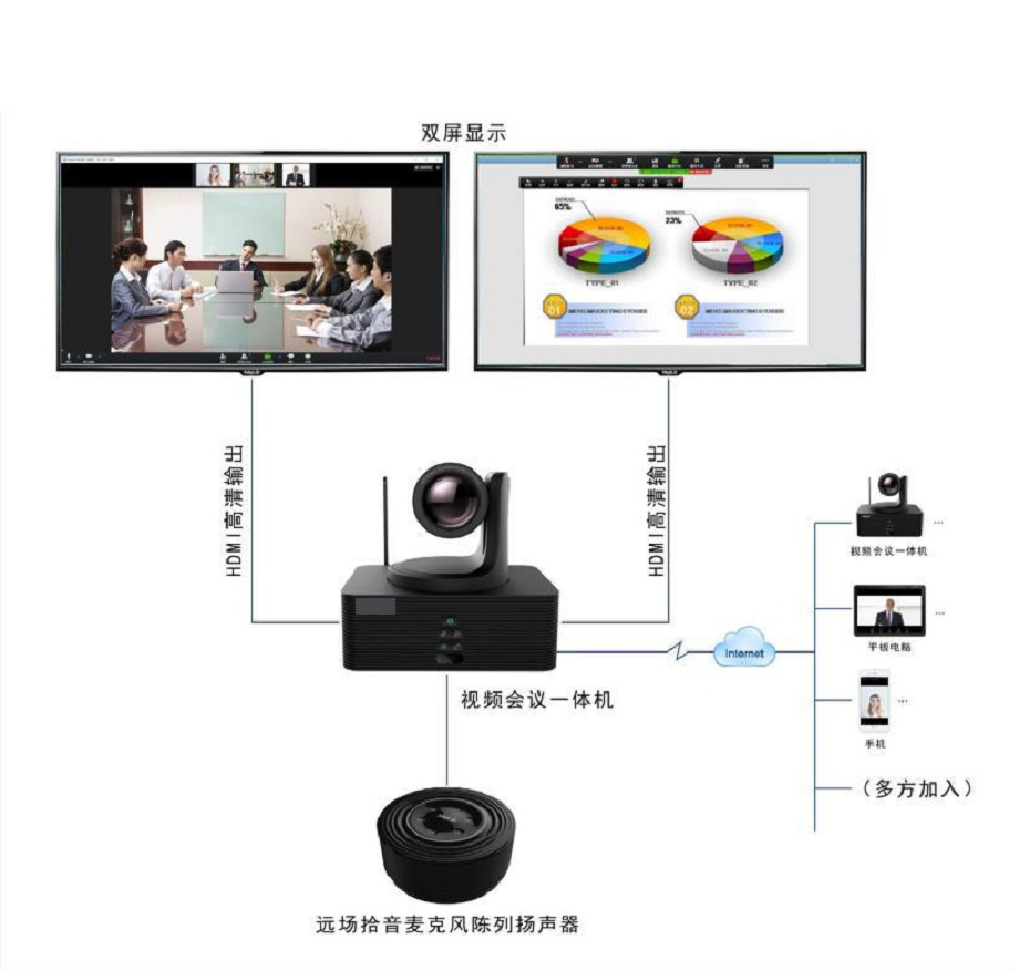 视频会议主机支持 2 路 HDMI 高清输出。采用双流、双屏技术,使视频和共享数据分开显示,无须切换,各种情景一目了然。开会的时候,一个屏幕用来观看摄像头视频,一个屏幕用来演示 PPT 等共享文件。
