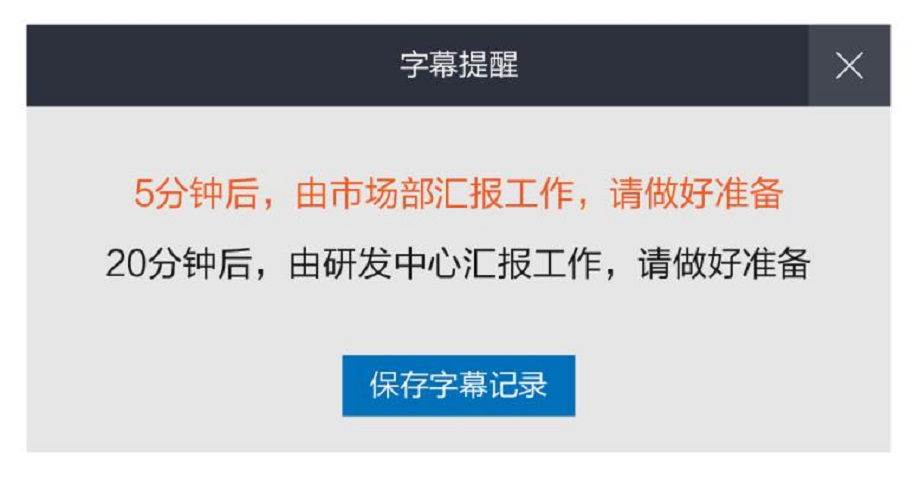 18、字幕提醒,在不打断会议的情况下,用字幕提醒参会者下一个议程或其他相关事项。