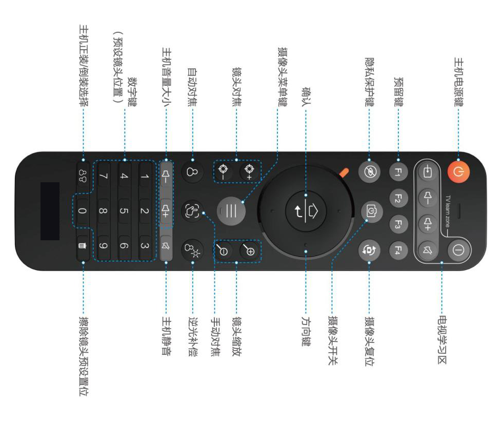 主机匹配学习型遥控器,简单方便。遥控器支持红外学习功能,可以学习电视机的按键,通过一个遥控器控制电视机和会议主机,变得更简单。支持遥控器操作会议主机,通过遥控器能实现:音量加减、静音、开 / 关主机、临时关闭摄像头画面传输、调整摄像头位置、进行变倍和对焦等操作。