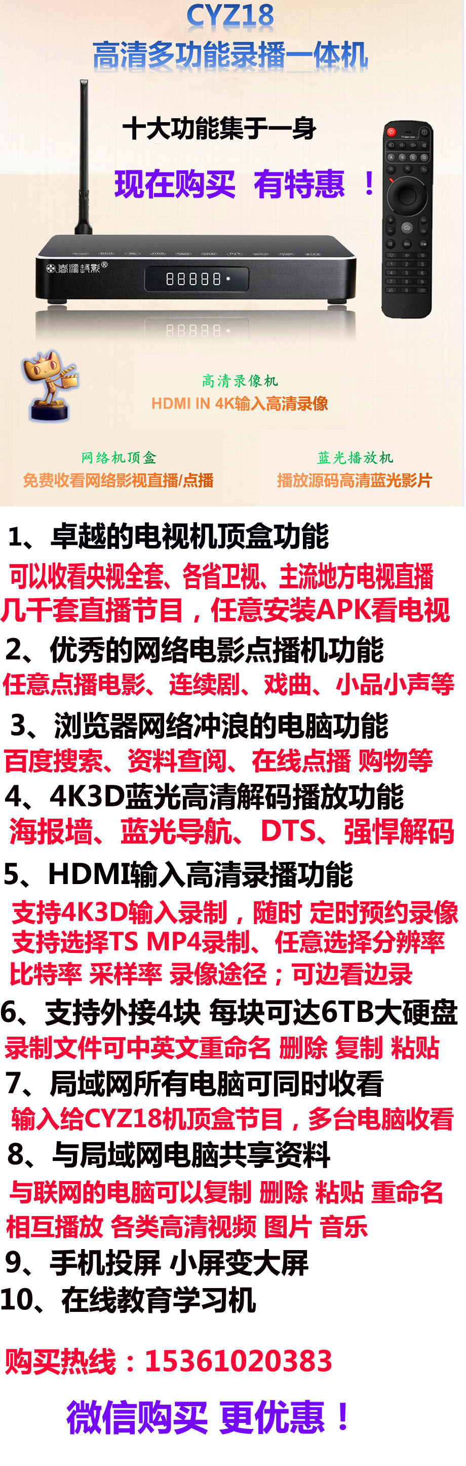 时下能看电视直播的网络机顶盒有很多,但是却只能看电视直播,功能单一,而有一款盒子,却一反常态,增加了几倍的功能!家中有这一款盒子,就代替了电视机顶盒、网络点播机、家用微电脑、蓝光播放机、高清录像机、电脑NAS共享播放机、手机投屏器等等,可谓一机多用,而售价仅仅千多元,性价比超高!怪不得这款盒子一上市就引起了强烈的轰动,一再复产却依然供不应求!下面就让我们了解一下这款盒子具备的神奇功能: