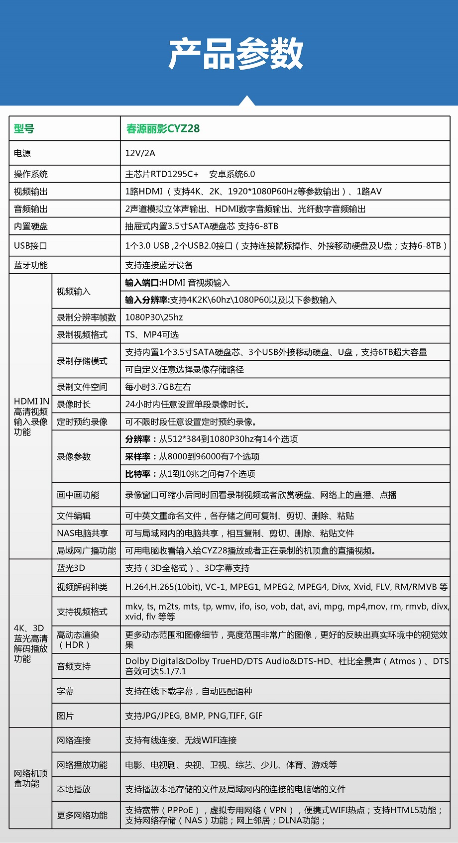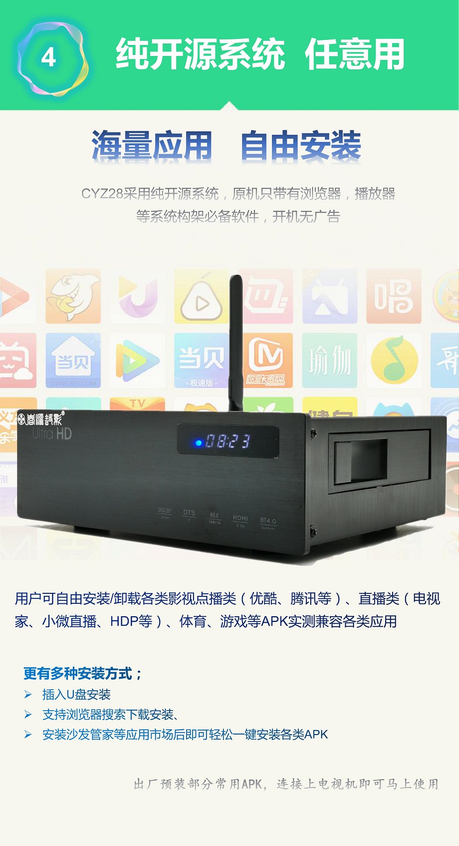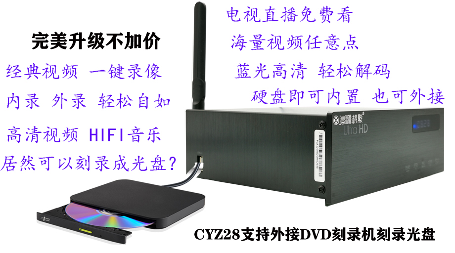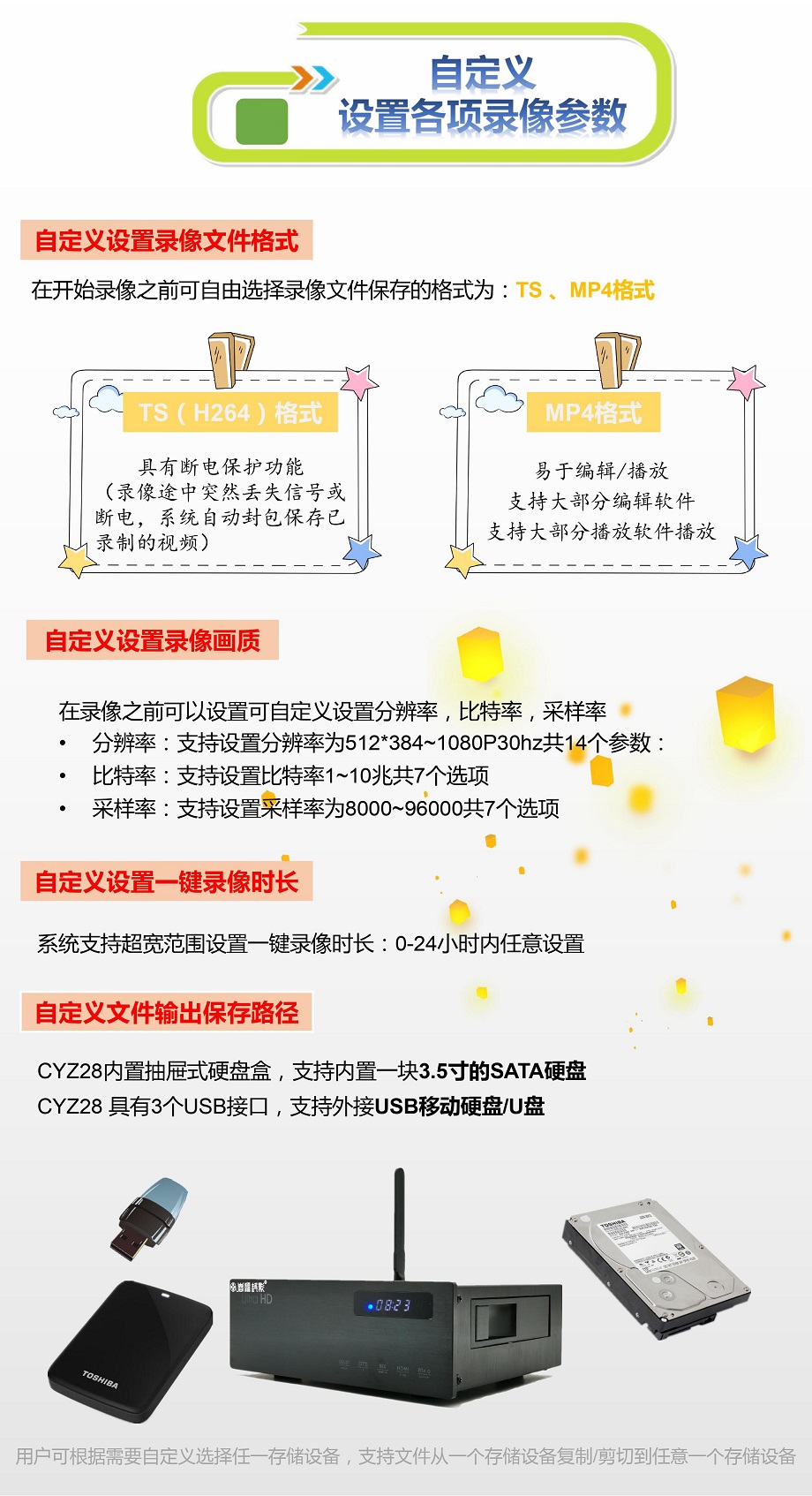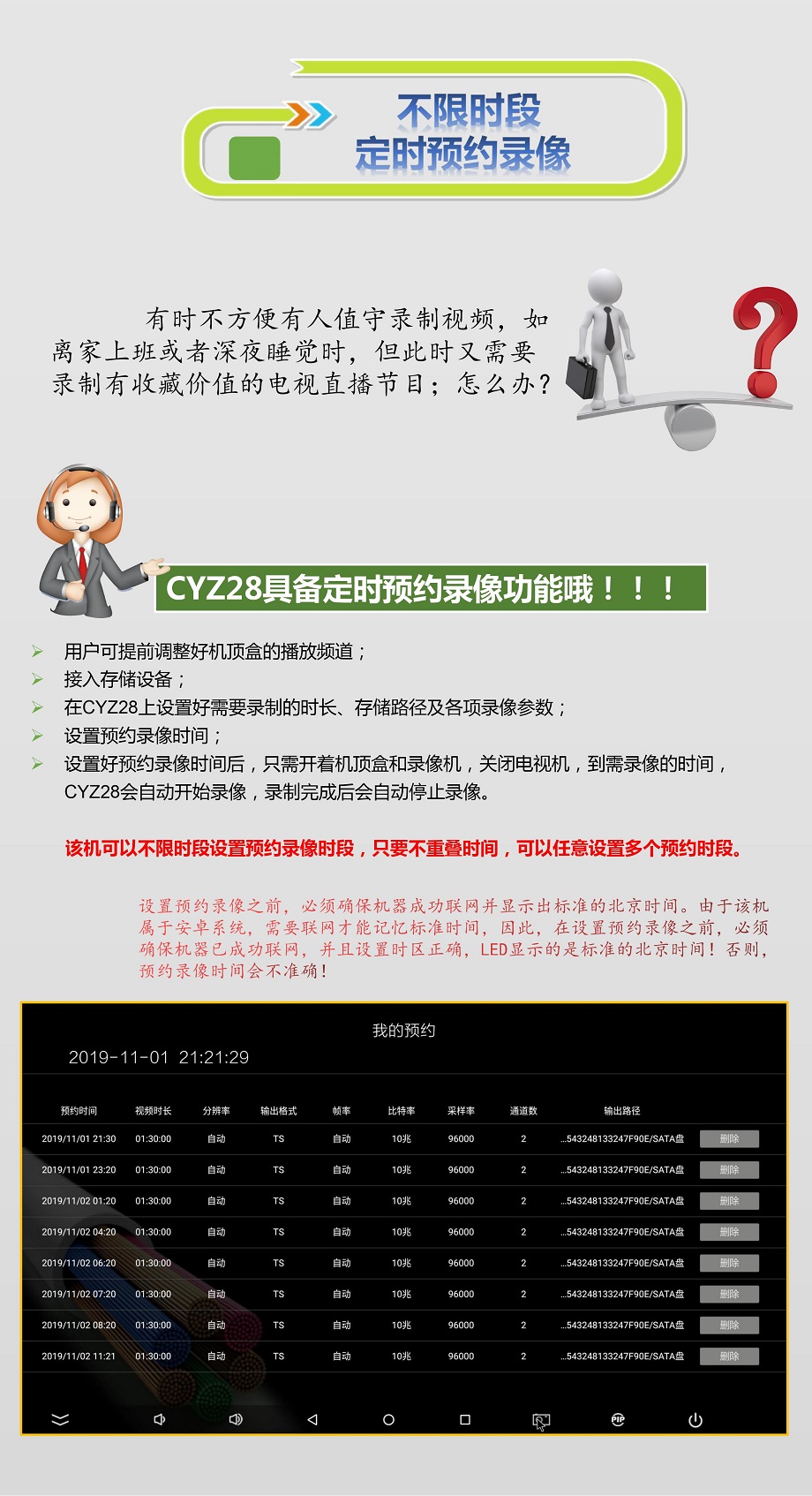 CYZ28的内录功能,操作十分方便,功能简洁实用。在收看本机安装的直播、点播软件播放的网络电视直播、影视点播的时候,如想录制,只需通过遥控器即可快捷开启录像菜单,选择好录像格式为MP4或者TS,选择好录像存储路径,既可以选择录制到内置硬盘中,也可选择录制到USB外接的移动硬盘里,然后点击开始录像就进入录像状态。开始录像后,机器前面板会有LED录像指示灯闪烁,同时,屏幕左上角会点亮一个微小的红色圆点。要停止录像,也是通过遥控器快捷停止。回看已经录制视频的方法,与播放硬盘里的视频的方法一样。回看了硬盘里的视频后,如想再次内录,重启机器后即可进行。