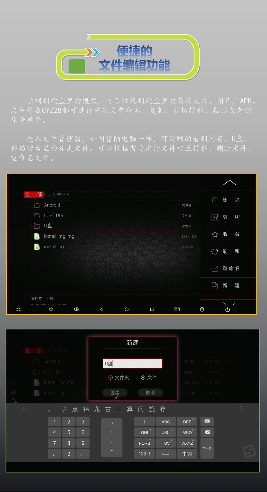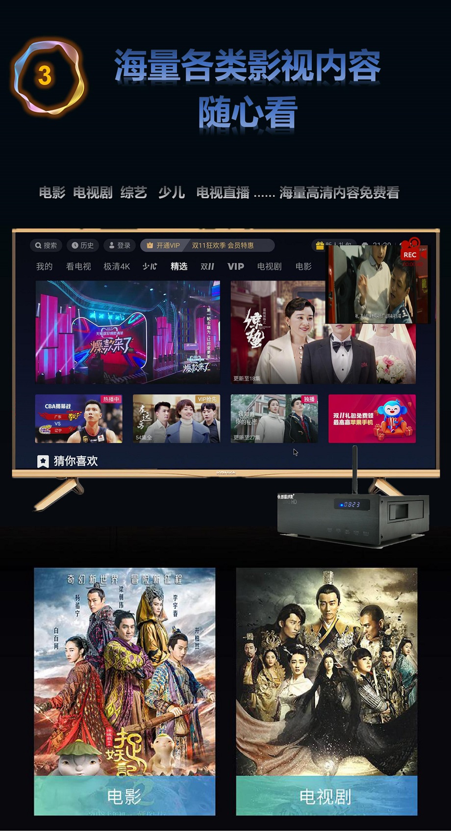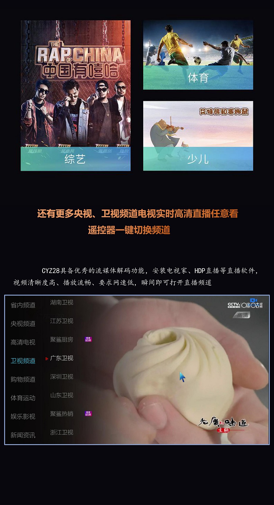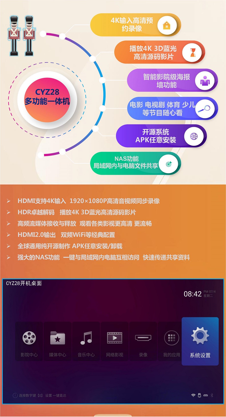 CYZ28的内录功能,操作十分方便,功能简洁实用。在收看本机安装的直播、点播软件播放的网络电视直播、影视点播的时候,如想录制,只需通过遥控器即可快捷开启录像菜单,选择好录像格式为MP4或者TS,选择好录像存储路径,既可以选择录制到内置硬盘中,也可选择录制到USB外接的移动硬盘里,然后点击开始录像就进入录像状态。开始录像后,机器前面板会有LED录像指示灯闪烁,同时,屏幕左上角会点亮一个微小的红色圆点。要停止录像,也是通过遥控器快捷停止。回看已经录制视频的方法,与播放硬盘里的视频的方法一样。回看了硬盘里的视频后,如想再次内录,重启机器后即可进行。