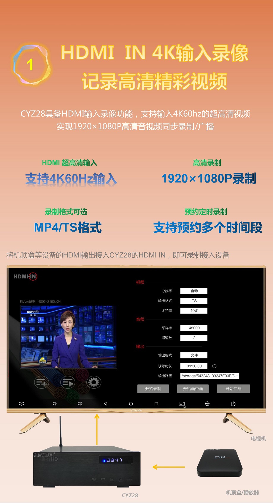 CYZ28内录的视频画质清晰度,根据网络直播、视频点播的源内容分辨率不同而不同。收看的视频源清晰度高,则录制下清晰度就高。如收看的是4K或者1080P60的网络视频,则录制后为720P60hz的高清视频,如视频源仅为720P60,则录制后只能接近720P60的效果。录制后的音质效果,基本保持了视频源的音质效果。由于该内录软件为初级版本,录制后的视频偶尔会有画面斜纹或者秒闪屏现象,将通过后续升级慢慢改善。作为一般影视剧情迷或者追剧迷或者一般网络资料收藏爱好者,该内录功能完全可以满足需要。如果是高清粉丝想实现真正的高清效果,则还是利用CYZ28的HDMI输入录制功能,进行外录。