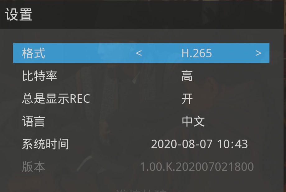 进入主菜单栏目,可调H265/H264编码格式;可调比特率高/低级别;可开启或者关闭REC录像提示图标;可修改中英文显示;可修改系统时间。