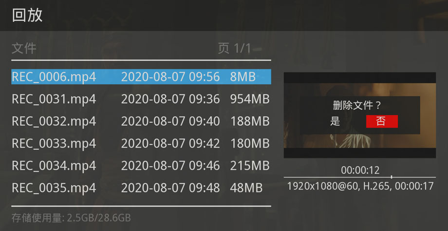 预览文件时,不需要的视频文件,可通过遥控器一键删除,省去了通过电脑删除的麻烦。
