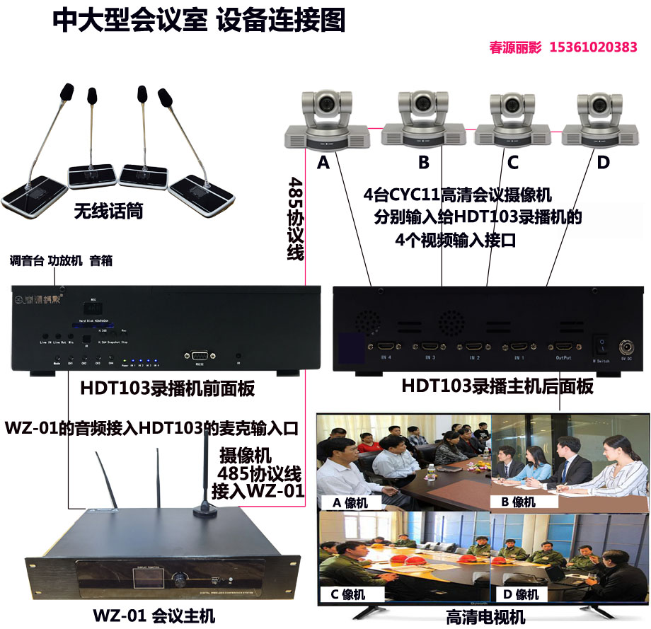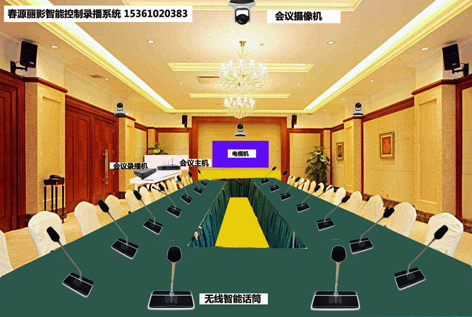 使用4台20倍云台式高清会议摄像机CYC11、4台无线智能麦克风、1台WZ-01智能会议主机、1台春源丽影HDT103 高清录播机。