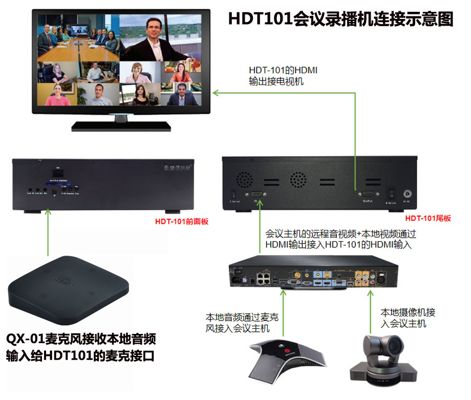 HDT101录播机,搭配全向麦克风QX-01,不仅支持会议终端设备的HDMI 4K含音频输入、输出和4K录制,而且支持另外输入线路音频、QX-01全向麦克风的音频进行音视频混音同步录制。不仅能录制远程音视频,也能录制下本地的音视频。
