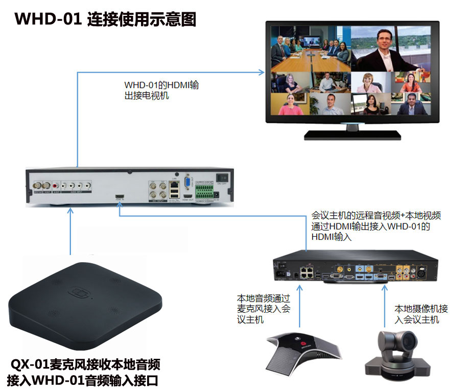 WHD-01录播机,支持视频会议终端设备的HDMI含音频输入录制,另外还有一路莲花音频输入接口,可以同时接入QX-01的本地音频。另外,WHD-01支持局域网、因特网远程电脑、手机同步直播、语音对讲;远程电脑点播、下载、电脑录制以及定时预约录像等功能。