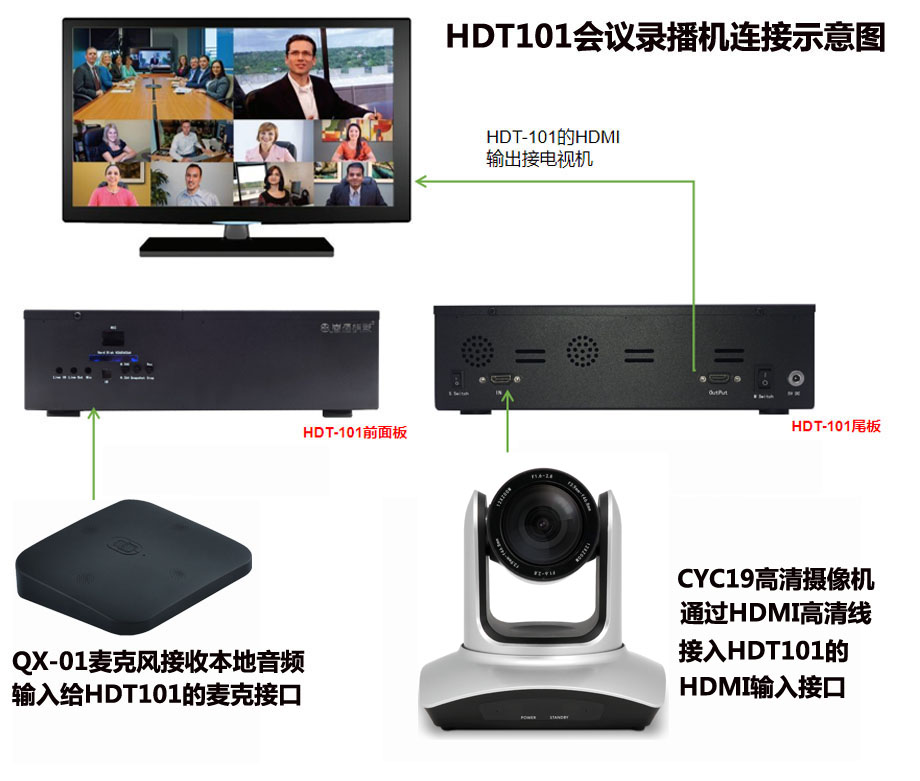 HDT103会议录播机,支持1080P60hz高清录制。具有4个HDMI输入接口,接入2台CYC19摄像机时,将HDT103的显示画面调整为左右或者上下或者一大一小显示模式。将QX-02过来的音频输入到HDT103的麦克音频输入接口。如果需要接调音台、功放机、音箱,则从HDT103前面板的音频输出接出。