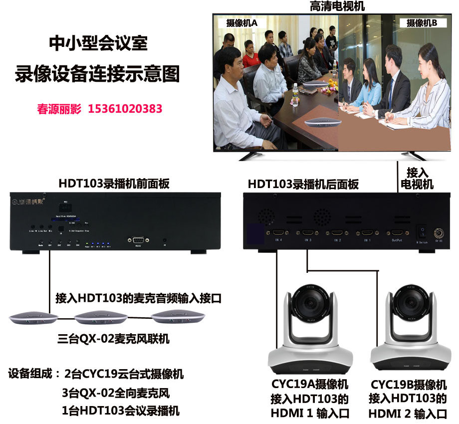 1台12倍云台式高清会议摄像机CYC19、1台QX-01全向麦克风、1台春源丽影HDT101 高清录播机。