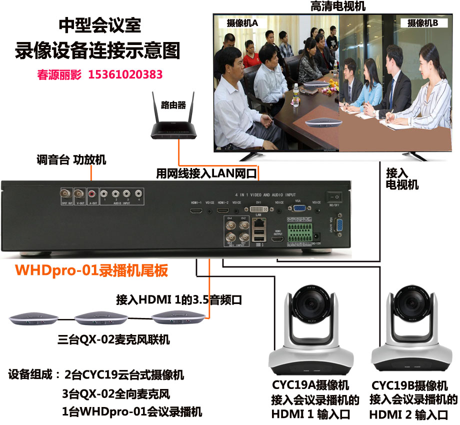 1台12倍云台式高清会议摄像机CYC19、1台QX-01全向麦克风、1台春源丽影WHD-01 高清网络录播机。