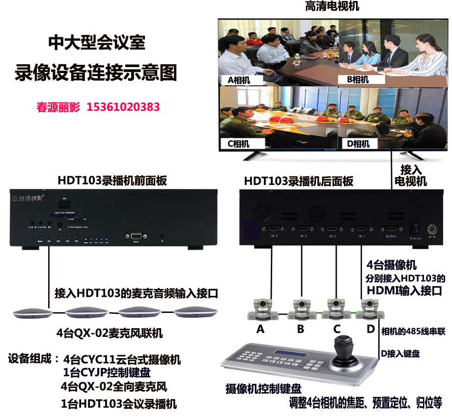 4台摄像机,一台主拍主席台,一台主拍会场全景,两台分别安装在会场左右两侧俯摄拍摄会场全景。4台摄像机分别输入给HDT103的4个HDMI输入接口;4台QX-02全向麦克风联机后,最后一台接入HDT103录播机前面板的麦克音频输入接口。从HDT103的3.5寸音频输出接口接入调音台、功放机、音箱。HDT103的HDMI输出接入液晶电视机。开机后,将HDT103的显示画面调成4画面显示模式。