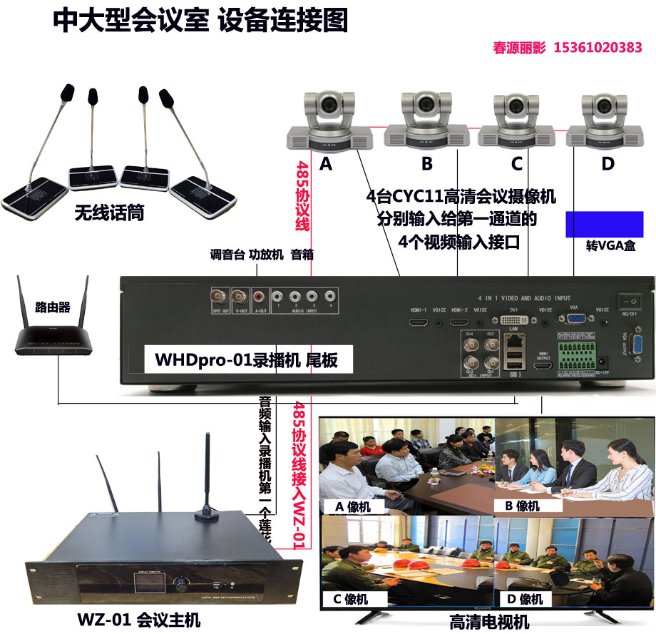使用4台20倍云台式高清会议摄像机CYC11、4台无线智能麦克风WT-01、1台WZ-01智能会议主机、1台全景高清网络型会议录播主机WHDpro-01。
