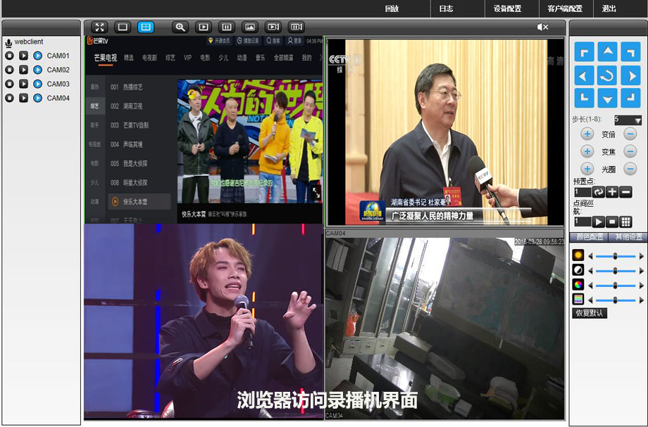 登陆界面左边有通道选择界面,可以选择主副码流(清晰度)。右边上面有控制输入给录播机摄像机的云台控制界面,可以调整摄像机的上下左右、推远拉近、放大缩小、预置定位等功能。左边下面有调整视频色彩、对比度、光亮度的界面。