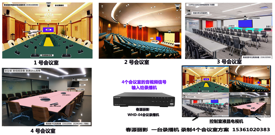 有些大中型单位具有多个会议室,有时多个会议室同时开会,有时只有其中一个或者几个会议室开会。对于这种多个会议室录像设备的配置,只用春源丽影的1台WHD录播机就可以实现。春源丽影WHD会议录播机,具有多款机型,支持1-16路会议摄像机同时输入或者任选输入路数录制。可以根据单位会议室数量,选购不同输入路数的机型。如有两个会议室,则用WHD-02,有三个会议室,则用WHD-03,以此类推。一台录像机,就可以同时录制多个会议室实况。