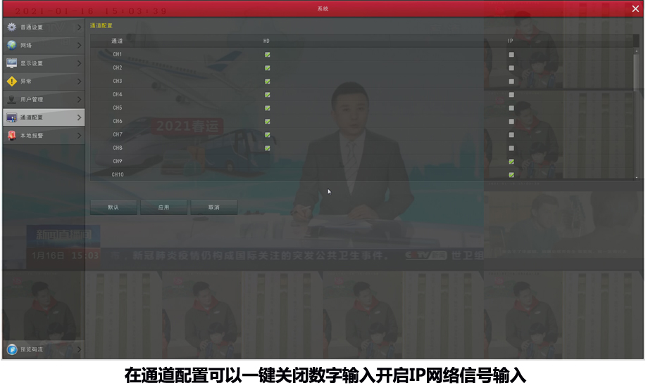 可根据需要开启或者关闭 通道标题,时间,视频丢失,警报,移动侦测图标,录制图标。