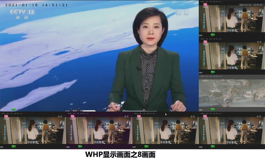 根据8路数字信号输入接口的不同,分为不同WHP机型。如8路HDMI输入的机型为WHP-01;8路VGA输入的机型为WHP-02;3路HDMI、3路VGA、2路SDI输入的机型为WHP-03;4路HDMI、4路VGA输入的机型为WHP-04;8路SDI输入的机型,为WHP-05。还可以根据客户需要,任意定制HDMI、VGA、SDI三种信号组合为8路输入的机型。单纯的使用这8路数字输入信号录播,则为HD DVR功能。还可根据实际需要,任意切换为IP网络信号输入录制,则利用了该机器的NVR功能。