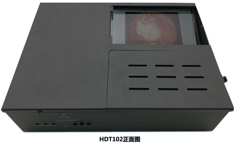 HDT102录播机,右前方配置了一块7寸高清显示屏,可以显示1080P60hz的高清图像,如果手术室面积受限,可以不用再外接大尺寸的显示器即可直接显示微创手术的清晰图像,也可直接播放已经录制的高清视频和图片。而且机器有屏幕专控电源硬开关,当HDT102的HDMI输出接口外接电视机显示4K高清图像时,可以根据需要直接关闭本机显示屏。