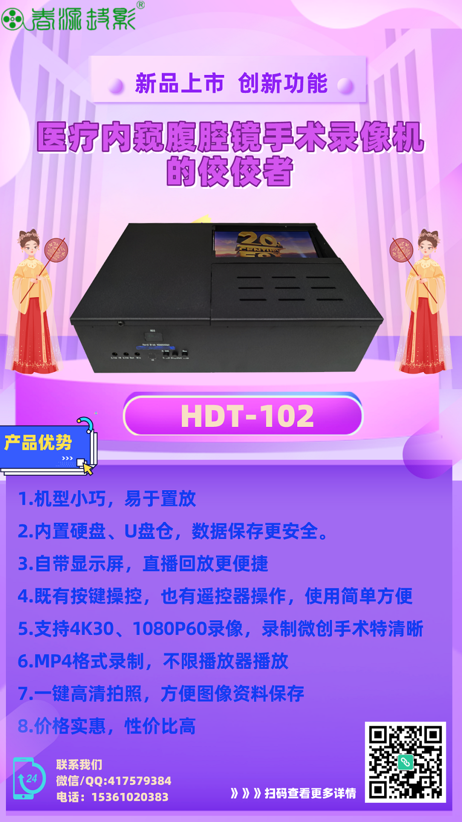 内窥腹腔镜录像机,不仅录制要清晰,价格要实惠,而且操控要方便,适宜在手术室的特定环境里快捷安装使用。纵观目前上市的各款内窥镜录像机品牌型号,不是机型庞大就是操控繁琐,而且大多价格昂贵,导致一般中小型医院望而却步。近日上市的深圳春源丽影电子科技有限公司研发推出的HDT102机型,则颠覆了内窥腹腔镜录像机的常规概念,机器具备了内窥镜录像机的八要素,小巧精致的机型,简单快捷的操作,4K1080P60录制的高清效果,尤其是低廉实惠的价格,成为众多医疗手术录像机中的翘楚而备受行业用户推崇!