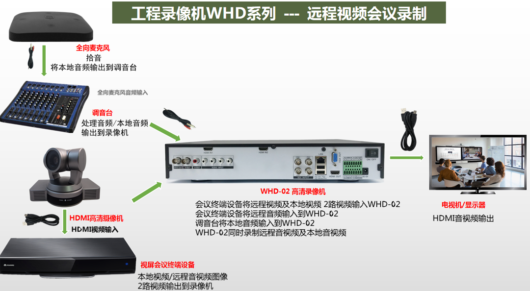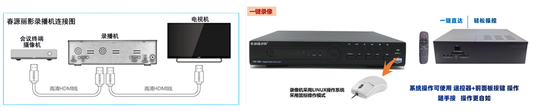 春源丽影录播机,安装连接十分简便。只需从会议终端设备或者会议高清摄像机的输出接口通过高清线接入录播机的输入接口,从录播机的输出接口接入电视机或者显示器,通过遥控器或者鼠标,就可便捷操控。有网络功能的机型,可以通过网络远程操控。可以一键录像一键截图一键播放一键删除。不用专业培训,一般人员就可以操作。