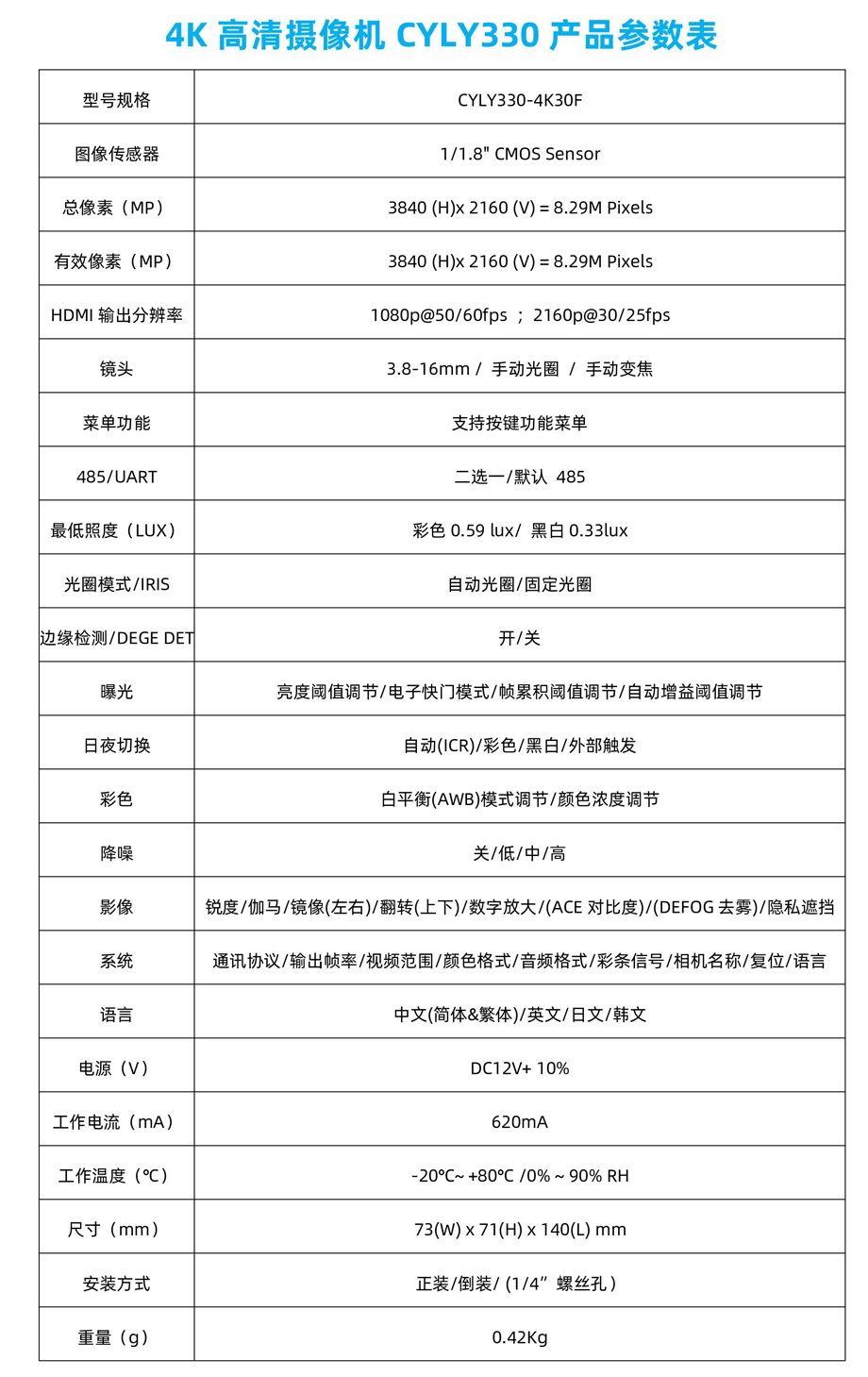 春源丽影4K高清摄像机CYC50技术参数表