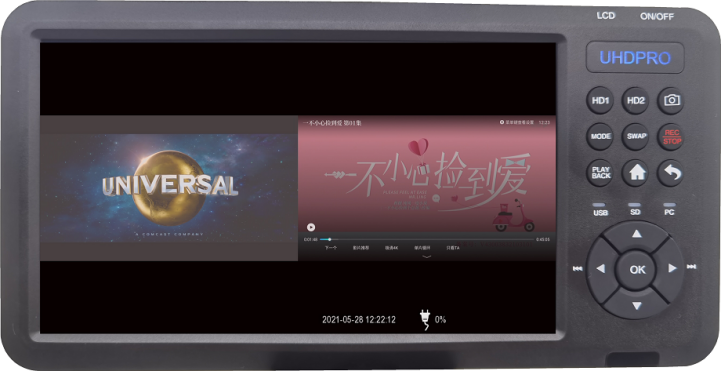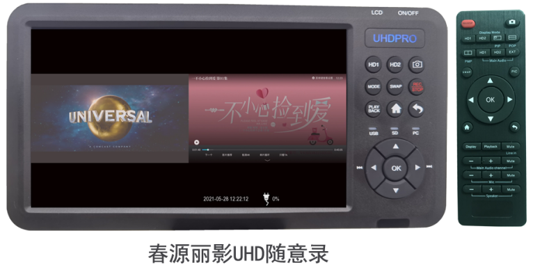 春源丽影UHD-01七寸屏录像平板,由于支持插入充电电池、自带有声屏幕、按键齐全、遥控便捷、机型小巧精致,携带方便,不仅适合固定场所录播使用,也适合移动录播,进一步扩大了使用范围,大大方便了高清粉丝爱好者高清视频的录制。该机可用于家庭录制数字电视机顶盒、录制电脑、录制蓝光高清播放机等HDMI输出接口的播放设备。