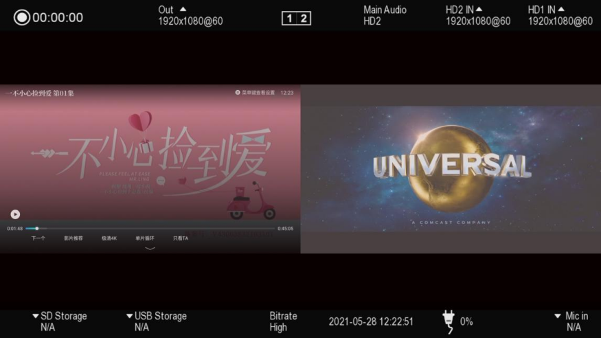 双HDMI输入接口,支持画中画模式录像,具有左右、上下、一大一小、单画面全屏显示模式。画面调整灵活,可以无缝秒切变换窗口。HDMI输入第一接口支持4K60hz;第二接口支持4K30hz输入。
