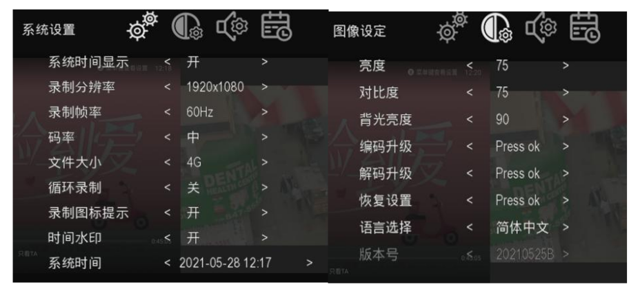 可以灵活调整录像分辨率为1080P60、1280*1024、1280*720、1024*768;录像帧率可选60或者50hz。录像码率可选高、中、低;录制文件格式MP4;音频为 AACLC;每小时录像占用4GB左右硬盘空间。可以选择每录制4GB或者16GB自动分段。支持开启循环录制或者录满停录。可开启或者关闭录像图标、录像进度条、系统时间水印。可调整录像亮度、背光亮度、对比度、饱和度等。