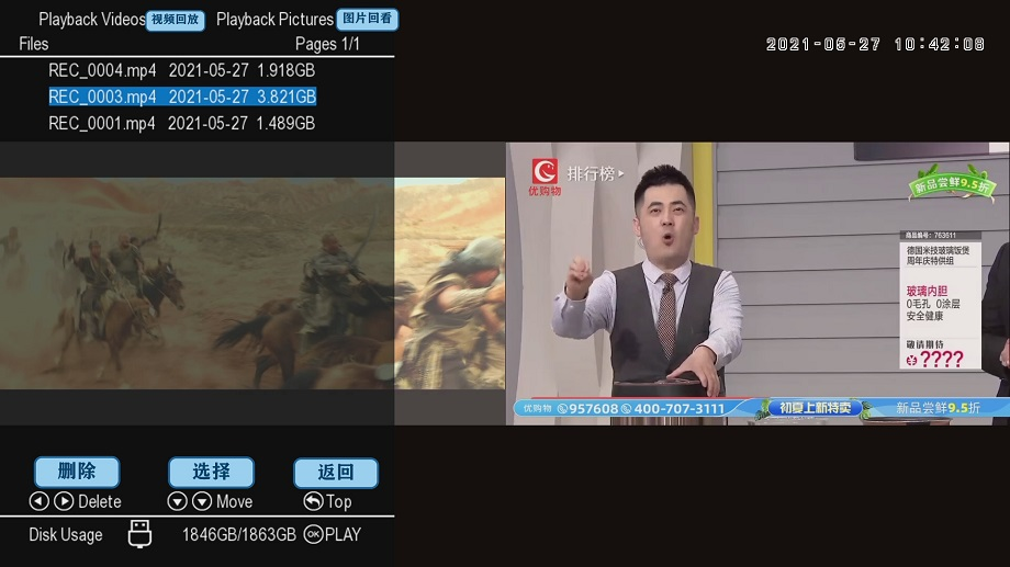 录像停止后,可以一键进入播放选项,任意选择USB或者SD卡。录制文件以录制时间排序,可以浏览全屏播放,播放时支持快进、快退、下一曲。