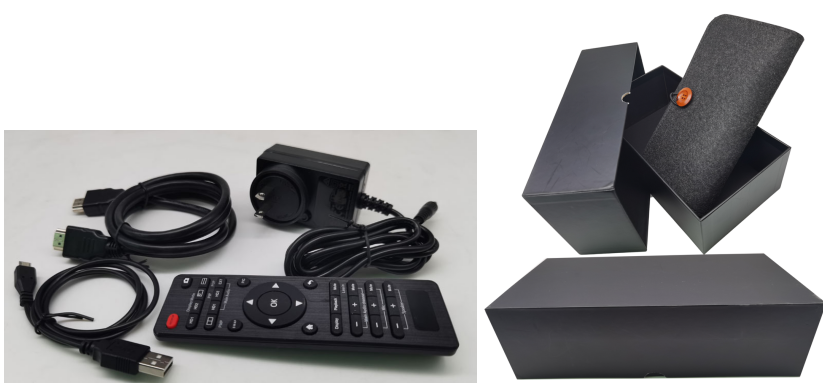 随机配件有:遥控器、电源适配器、HDMI高清线、接电脑用的USB线。