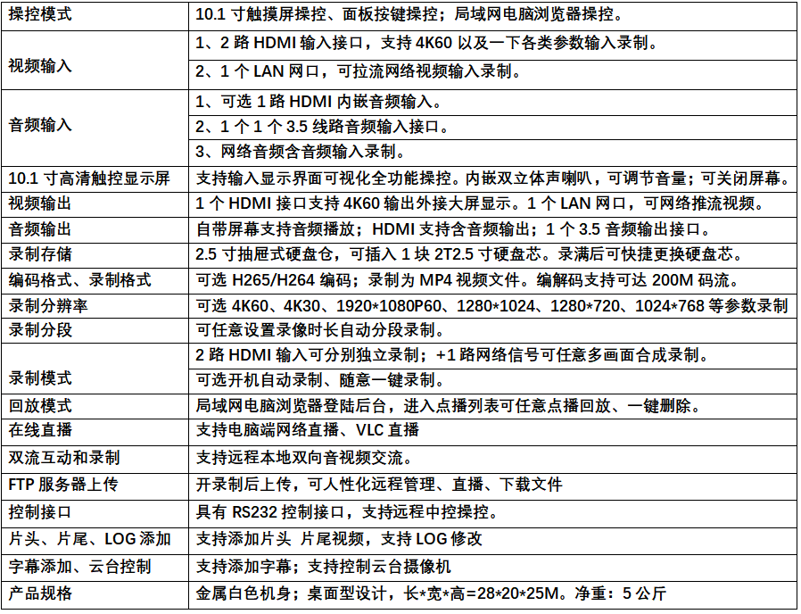 春源丽影WHV-260P高清录像机,支持2路HDMI输入,还支持拉流一路网络信号输入录制,其突出优势是2路HDMI输入,都可以支持4K60输入、录制,10.1寸高清触控屏,操作简单快捷,是一款真正的高清录像机!