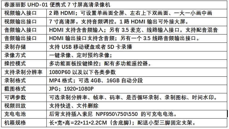 春源丽影UHD-01是一款便携式高清录像机。自带7寸高清显示屏并支持音频播放,支持插入充电电池录播。
