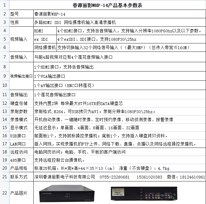 深圳春源丽影电子科技有限公司推出的WHP-14高清录播机,由于支持4路HDMI、4路SDI、24路网络摄像机共计32路输入高清录制,成为目前数字高清录播机行业的航空母舰!既可以作为会议录制,也可同时用于高清监控录播,一机多用,深受客户欢迎!功能实用、操作简便、价格实惠,是WHP-14的显著优势!