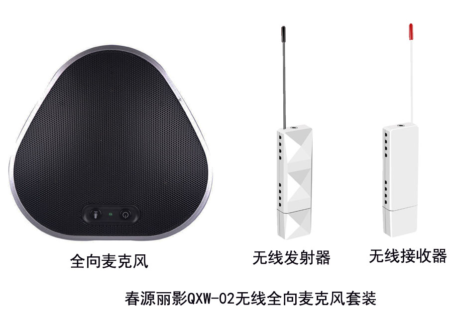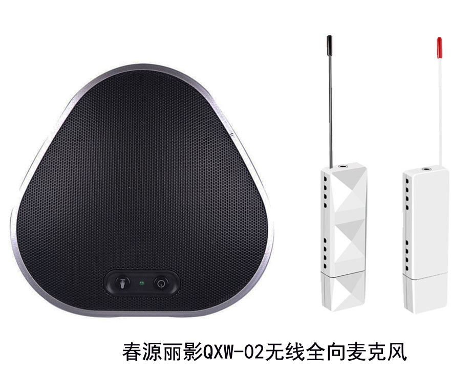 春源丽影QXW-02无线全向麦克风,可以多人用一个话筒远距离讲话,避免了人人都要配置鹅颈话筒的浪费和麻烦,同时,在不便布线的场合,可以将音频无线传输给几十米外的录播机、音箱等设备,不仅减少了施工的麻烦,而且让会议室场景更整洁。该设备也大大方便了一般家庭用户将电脑、手机等设备的音频远距离传输播放,具有十分高的使用价值。全向麦克风和无线音频发射接收器,既可以成套购买,也可单独采购。