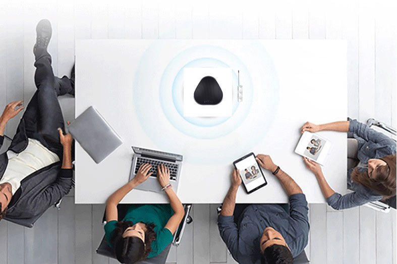 一般20多个人的圆桌会议,在会议桌中间置放一台QX-02全向麦克风和一个CYWY无线音频发射器,通过3.5音频线将两者连接,给两款设备供电后即完成了装配。