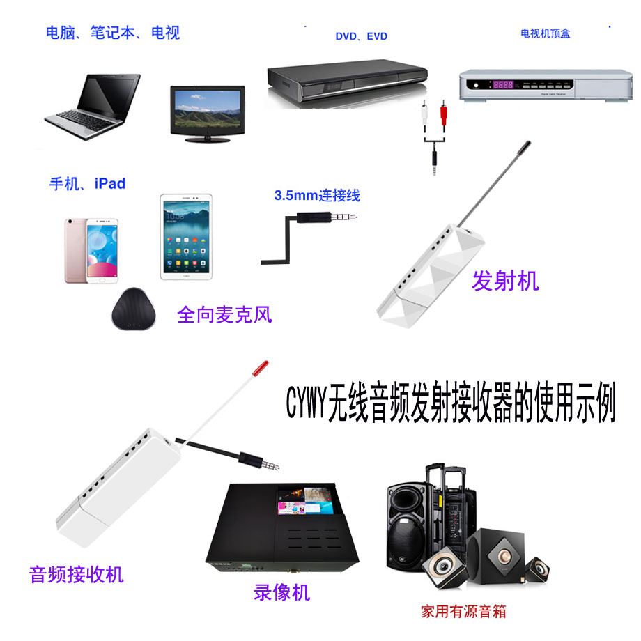 CYWY无线音频发收器,由发射器和接收器组成,小巧精致,类似一个U盘大小,发射器带有3.5音频输入接口,接收器带有3.5音频输出接口,都是USB供电。发射器可以将3.5音频输入的声音,无线无障碍发送60米的远距离,通过接收器接收后,将3.5音频线输入给会议录播机、有源音箱等设备,源码播放出立体声音质。不仅不会降低音量,而且有一定的放大功能。该机不仅适合接入全向麦克风的声音进行远距离传输,也可接入手机、平板、电脑等设备的3.5音频进行远距离传输给有源音箱等其他声音播放设备,具有广泛的使用用途。