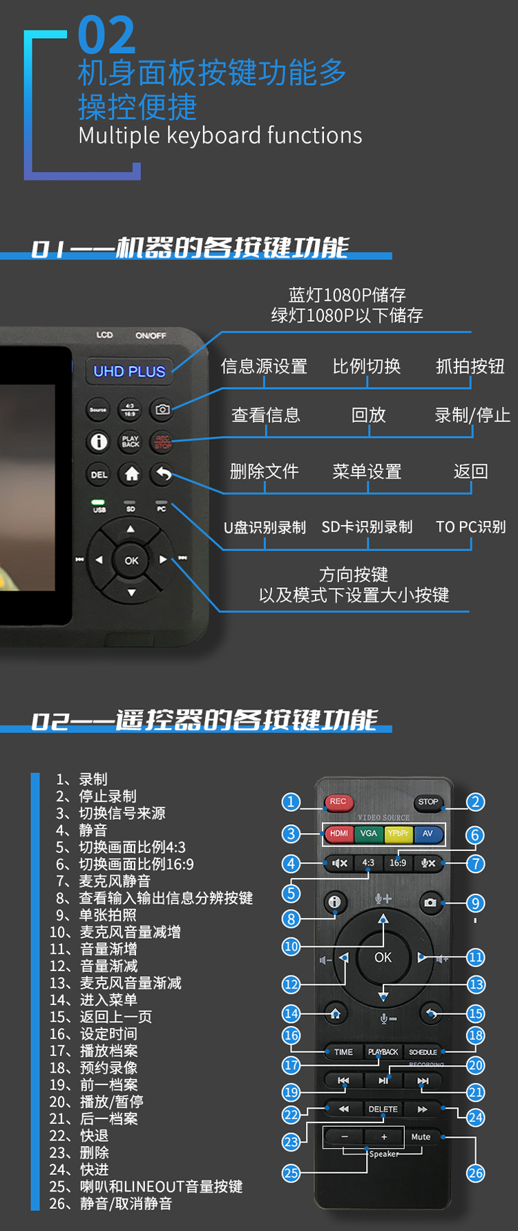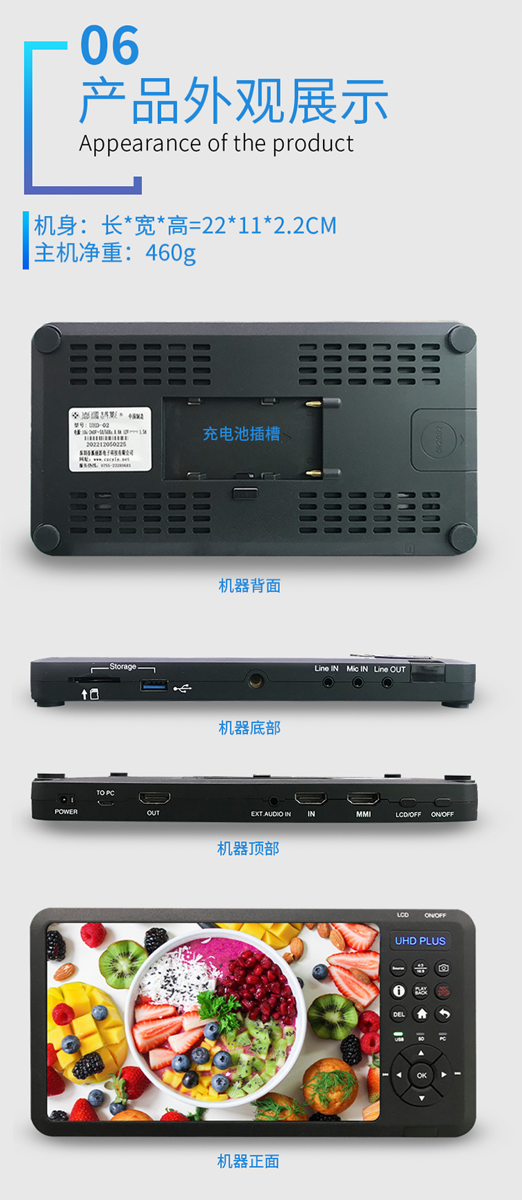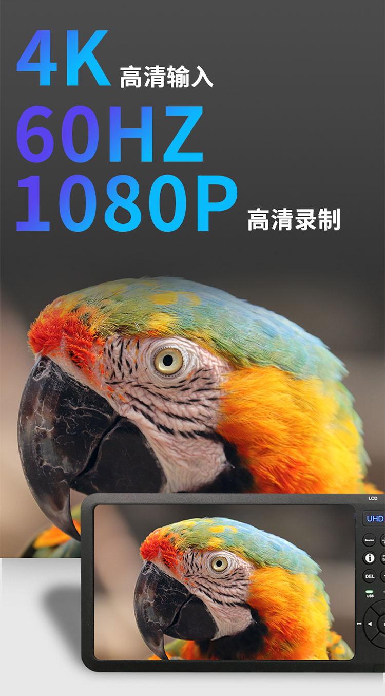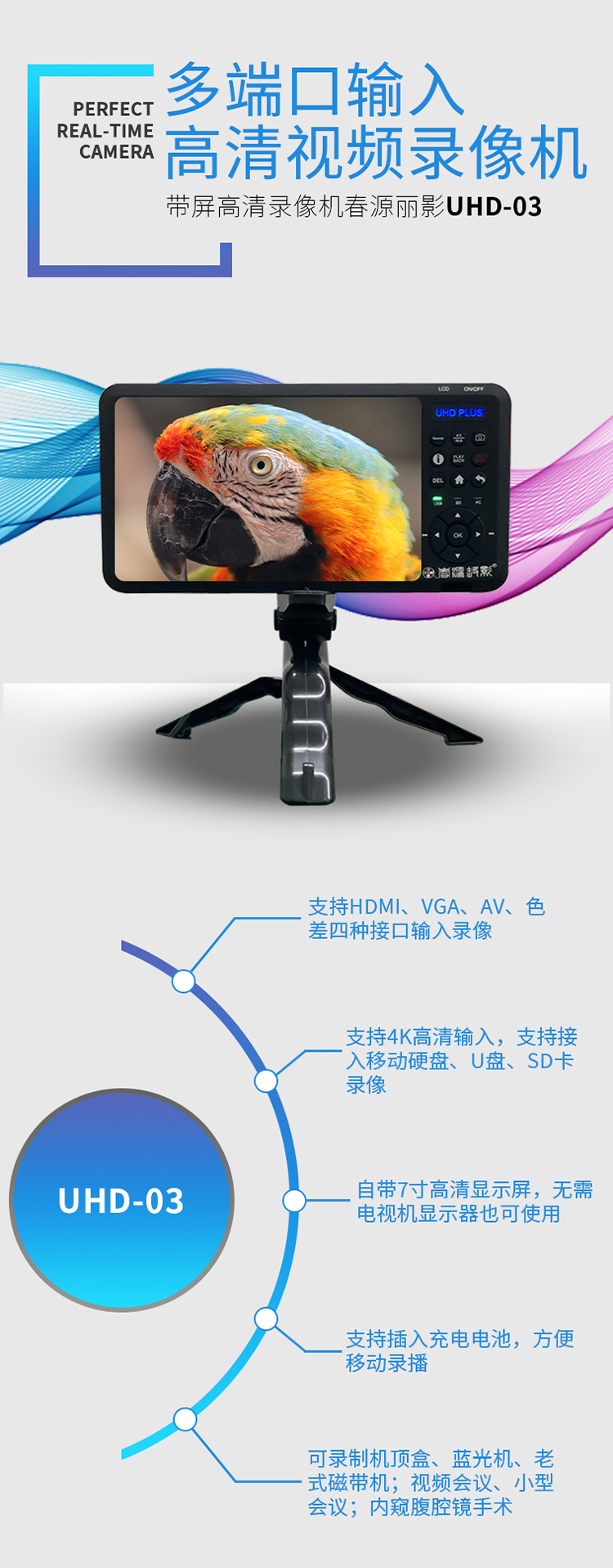 UHD-03高清录像机,带7寸高清显示屏,可插入充电电池,支持HDMI VGA AV 色差输入录像。HDMI支持4K输入,可以录制1080P60高清视频。具有3.5麦克、线路音频输入接口。既可以外接移动硬盘录像,也可插入SD卡录制。可以定时预约录像、循环录像!可以一键截图!是录制数字电视机顶盒、录制蓝光播放机、录制电脑、录制游戏、录制视频会议、小型会议、录制医疗内窥腹腔镜的理想产品!