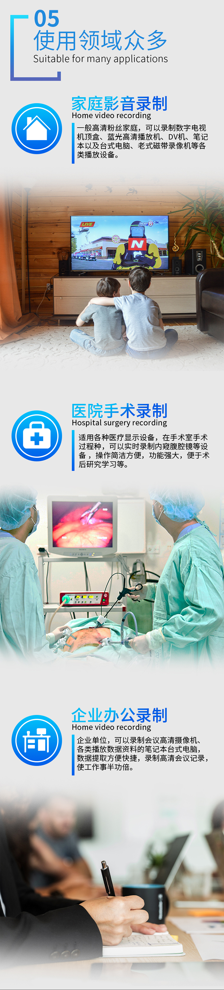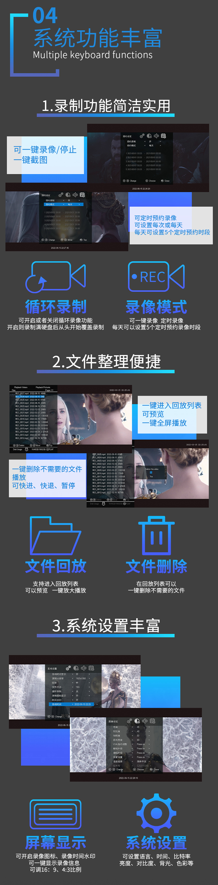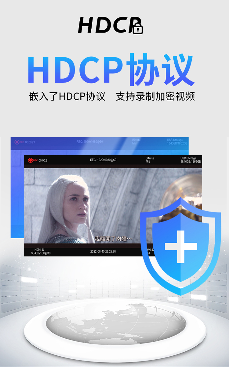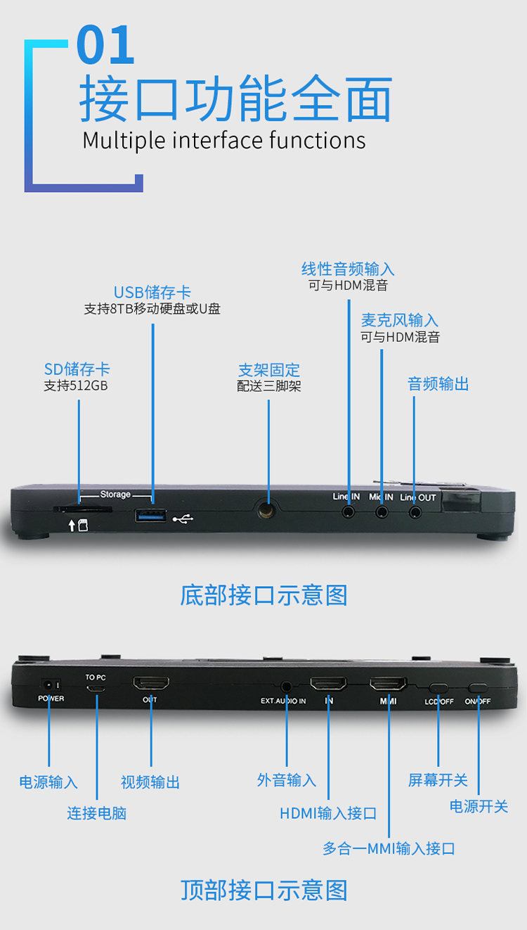 UHD-03高清录像机,带7寸高清显示屏,可插入充电电池,支持HDMI VGA AV 色差输入录像。HDMI支持4K输入,可以录制1080P60高清视频。具有3.5麦克、线路音频输入接口。既可以外接移动硬盘录像,也可插入SD卡录制。可以定时预约录像、循环录像!可以一键截图!是录制数字电视机顶盒、录制蓝光播放机、录制电脑、录制游戏、录制视频会议、小型会议、录制医疗内窥腹腔镜的理想产品!