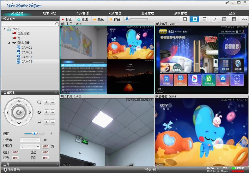同一个客户端,可以任意添加多台录播机型号。想收看那一台机器,就点播那台机器的名字。每台机器物理输入以四通道模式显示;IPC输入模式,则有16/8/4/1显示画面模式。可以任意放大一路信号全屏显示。
