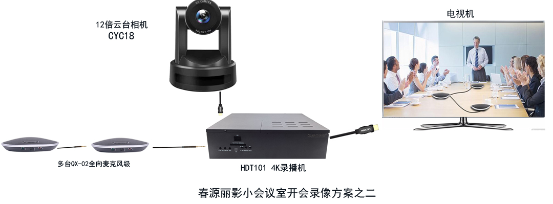 根据桌面布局,可以配置2-3台QX-02全向麦克风进行级联,通过音频线接入HDT101前面板上的3.5麦克接口;从12倍CYC18 云台摄像机的HDMI输出接口通过HDMI高清线,接入HDT101录像机的HDMI输入接口,从录像机的HDMI输出接口,通过HDMI高清线接入液晶电视机。
