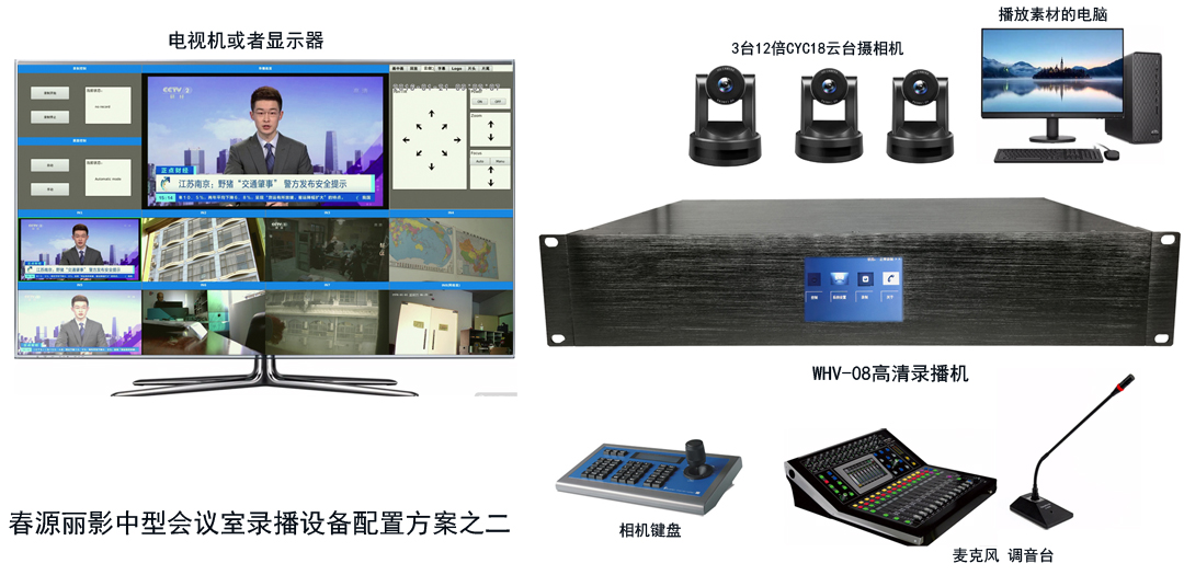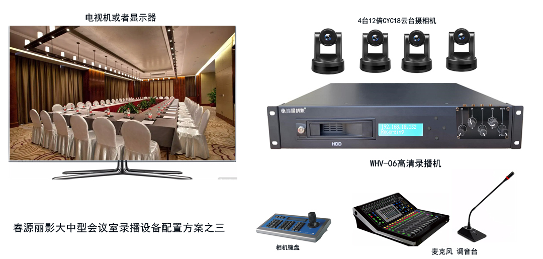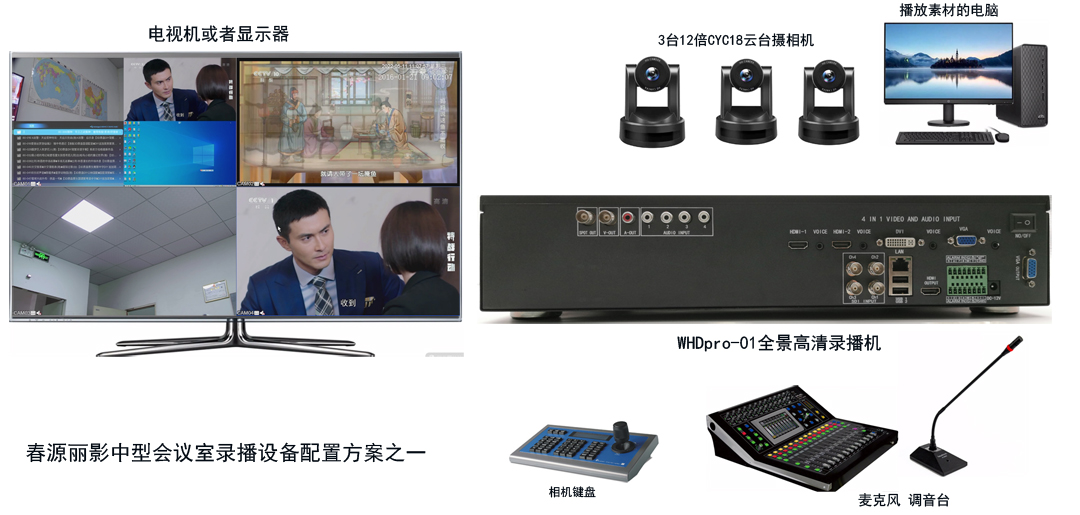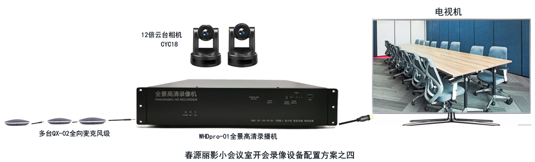 比较大一点的中型会议室,需要配置至少3台CYC18云台会议摄像机,有时还需要电脑播放会议课件;这种情况下,推荐使用春源丽影WHDpro-01全景高清录播机。