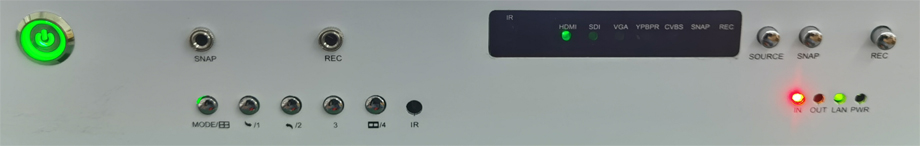机器正前面,左边侧有一个弹出式亮灯开关;左侧上面分别是脚踏控制器截图和录像插口;左侧下面是多画面画中画模式调整按键和画面遥控接收窗;右侧上面分别是录像遥控接收窗、HDMI、SDI、VGA、色差、AV信号源选择指示灯、截图、录像状态指示灯。右侧上面分别是 信号源选择按键、截图按键、录像按键;下面有网络远程互动4个指示灯。