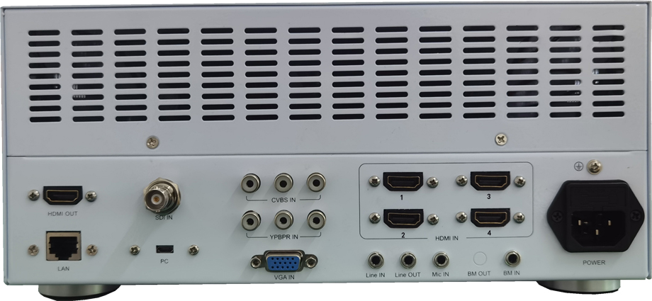 视频输入:一组4个HDMI输入接口,可以多画面合一录制;SDI、VGA、色差、AV输入接口各有一个,分别录制;共8个视频输入接口。具有1个千兆自适应LAN网口,支持拉流输入远程网络信号。