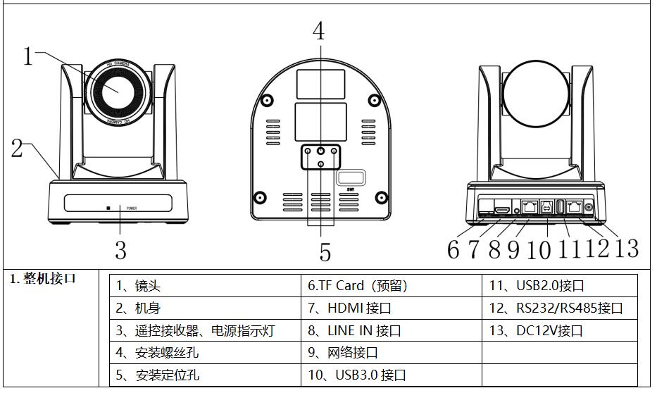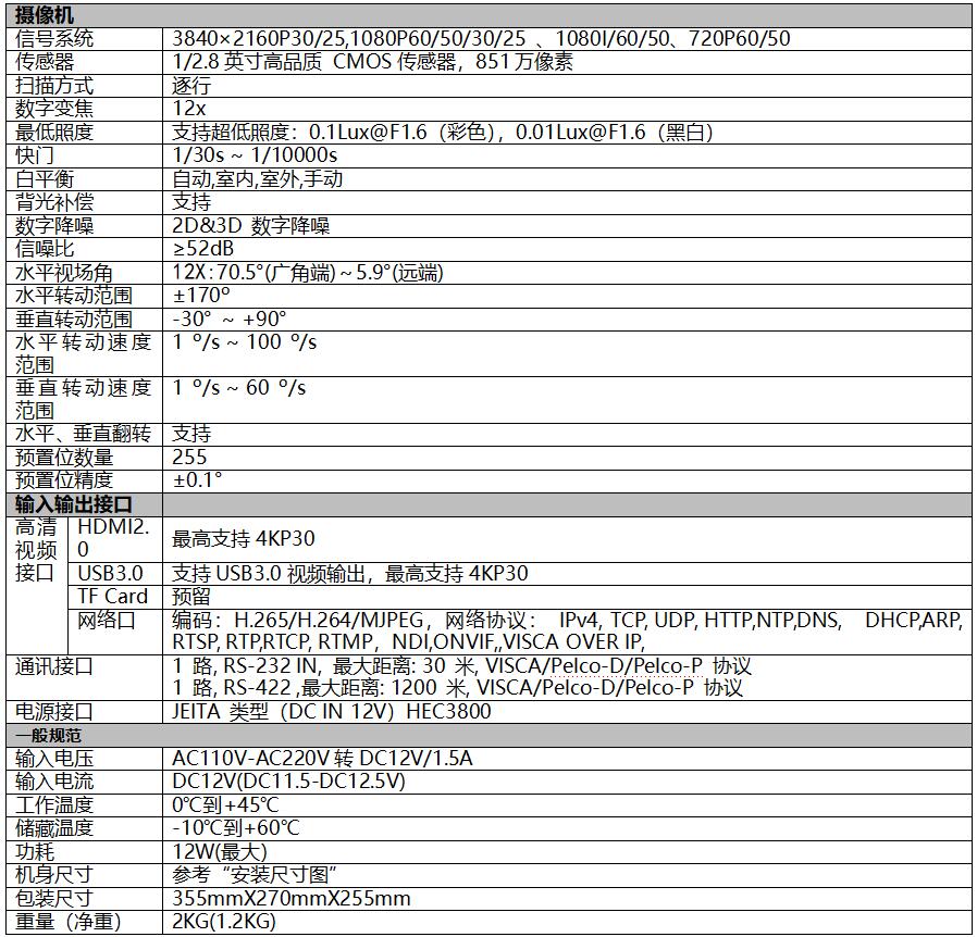 该款摄像机凭借先进的控制算法能实现定位精确、流畅、安静的PTZ控制,摄像机宽角度的镜头能在视频会议期间轻松地覆盖室内所有人,配置255个预置位,使其能够轻松、快速地再现清晰画面,而且不会对演讲者或观众产生任何干扰。 为了方便控制和观看,同时能自动接收VISCA命令和PELCO-P/D协议命令, ![]() 产品亮点: l 定位精确、流畅、安静的控制算法PTZ控制 采用先进的控制算法的精密电机驱动,操作起来非常安静、流畅、平稳,能精确和快速地移动到指定位置,并进行大范围的拍摄。 l 真正的4K高清图像 采用1/2.8英寸,851万有效像素的高品质 “Exmor R” CMOS Sensor传感器,可实现 3840×2160 超高分辨率的优质图像。在保证超高清晰度的同时,重点满足了对画面流畅性的需求。 l 低噪声高信噪比 应用了2D和基于运动估计的3D降噪算法,采用新一代低噪声传感器,有效的降低了噪声。 l 12倍光学变焦 70.5度大视角 12倍数字变焦 12X光学变焦,70.5度水平视角,12倍数字变焦 l 4KP30高清的HDMI视频输出 支持4KP30/25,1080P60/50/30/25、720P60/50等多种高清视频制式。 l 4KP30高清的USB3.0视频输出 支持4KP30/25,1080P30/25、720P30/25等多种高清视频制式。 l 4K高清的网络视频输出 支持4K,1080P30/25,720P30/25等多种高清视频制式。 l 255个位置预设位 可通过串口对255个位置进行预先设置,包括水平、俯仰、变倍进行预设,即使在摄像机掉电关闭时,预设数据也可以保存下来。 l 多功能遥控器 配备有操作简便的遥控器,除了可进行基本设定,以及对水平、俯仰、变倍等进行控制外,还可以通过遥控器调出菜单设定摄像机的相关参数。 ●OSD中英文菜单功能 丰富的OSD菜单,可用遥控器控制中英文OSD菜单。 应用场合 会议系统、远程医疗、远程教学等 摄像机接口功能 ![]() ![]() 产品参数: ![]() |